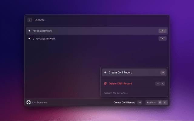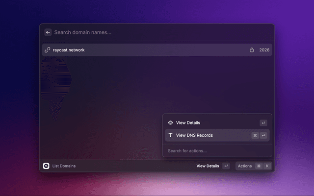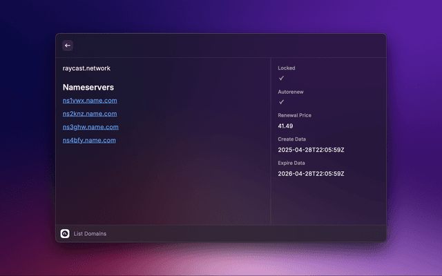 This is a Raycast extension for Name.com. With this extension, you can view Account Balance, Domains, DNS Records, and Delete DNS Records.