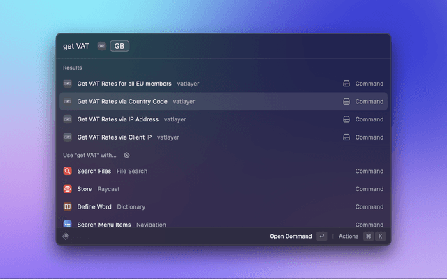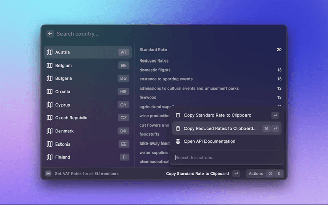 This is a Raycast extension for vatlayer. With this extension you can Validate VAT numbers, retrieve all or single EU VAT rates based on IP address or country code, convert prices in compliance with EU VAT rates and types, and more, using vatlayer API.